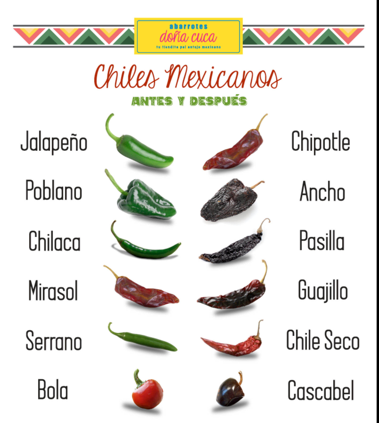 Y por último, ¡descubrí que los chiles o ajíes cambian de nombre luego de pasar por el proceso de secado! Véanlo en el dibujo anterior.