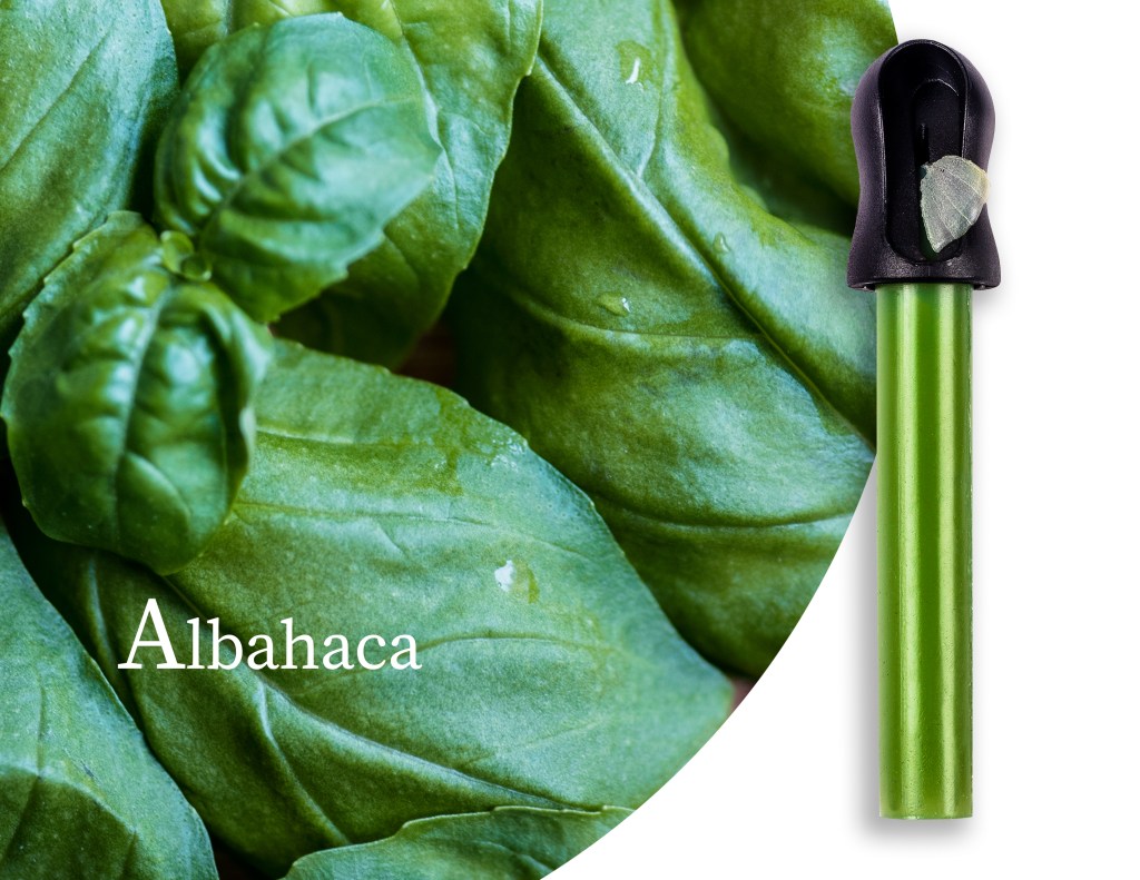 El sabor de la albahaca sea cual sea su variedad dependerá de las condiciones de crecimiento, cultivo, época del año en la que es cosechada e incluso de la fase de crecimiento en la que es recogida la planta. En general las hojas más jóvenes de la albahaca dulce pueden tener hasta cinco veces más compuestos aromáticos que las hojas viejas, cambiando además en toda la longitud de las mismas; la punta más vieja estará dominada por notas de estragón y clavo, mientras que en la base joven, las notas tenderán a eucalipto y flores. Si pudieran fijarse bien en el envés de las hojas de la albahaca podrá notar como unos puntitos, en ellos se encuentra cavidades que presentan glándulas en donde se concentran los aceites esenciales con una amplia gama de compuestos. Los más comunes son: cineol (fresco), linalool (floral), metil-eugenol (cálido y dulce), estragol (anisado) y finalmente en conjunto el cineol y el eugenol que son los que le dan ese carácter penetrante.